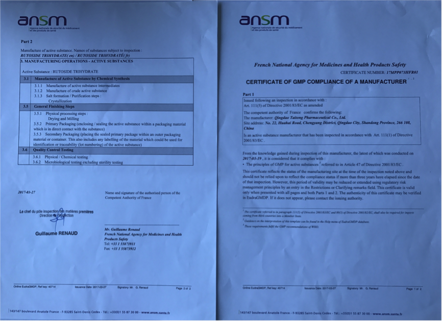 2017年3月取得蘆丁歐盟EDQM及法國(guó)GMP證書(shū)